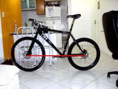 E notem que mesmo com a traseira em 26", o movimento central ainda ficou abaixo da linha dos eixos das rodas, que muito provavelmente vai deixar a bike mais ágil com maior maneabilidade.