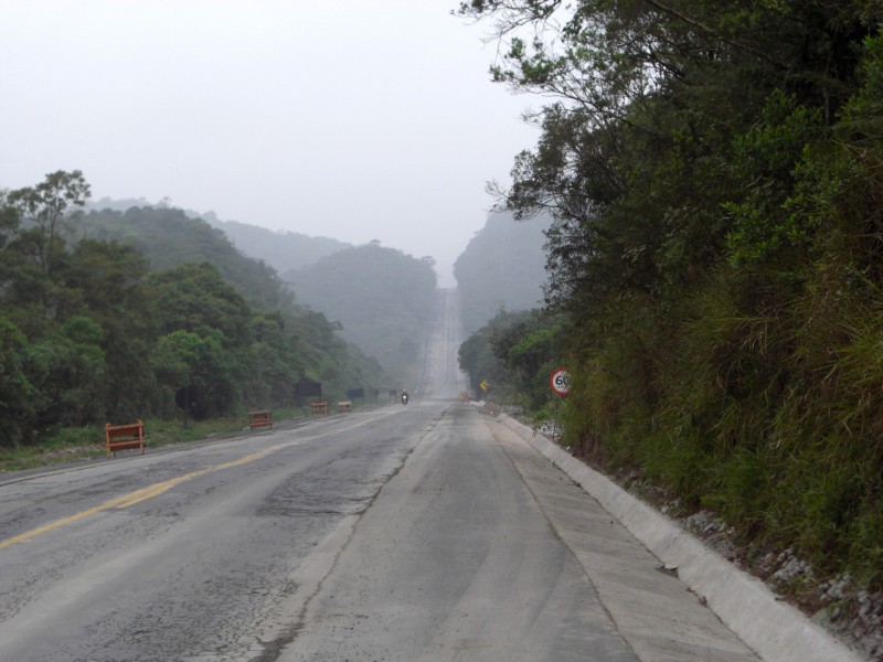 A Rod. Índio Tibiriça está em obras, e como estava muita neblina, resolvi pedalar forte para ganhar tempo. Vários trechos sem acostamento. Só parei em Rio Grande da Serra para encher a garrafa de água. E dá-lhe frio e neblina: